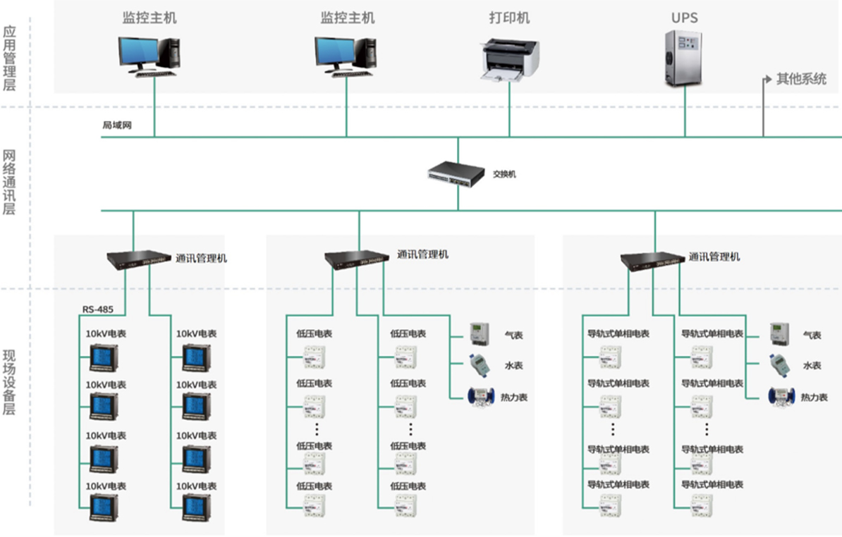 設備層:主要用于現場供配電設備數據、狀態信號的采集和控制。設備層由監測系統所使用的各類高壓/低壓電表氣表、水表、熱力表等智能終端組成。
